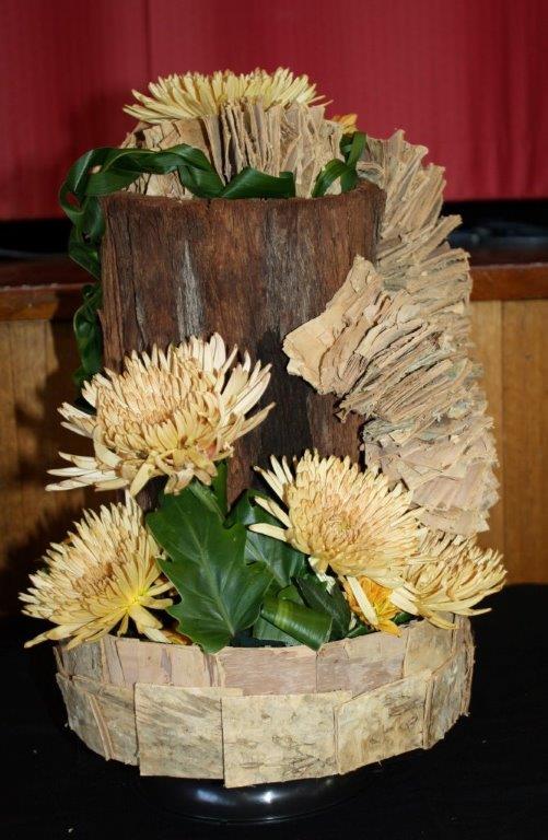 contemporary arrangement featuring chrysanthemums and bark – Brighton show 2014