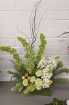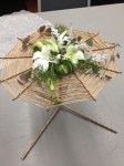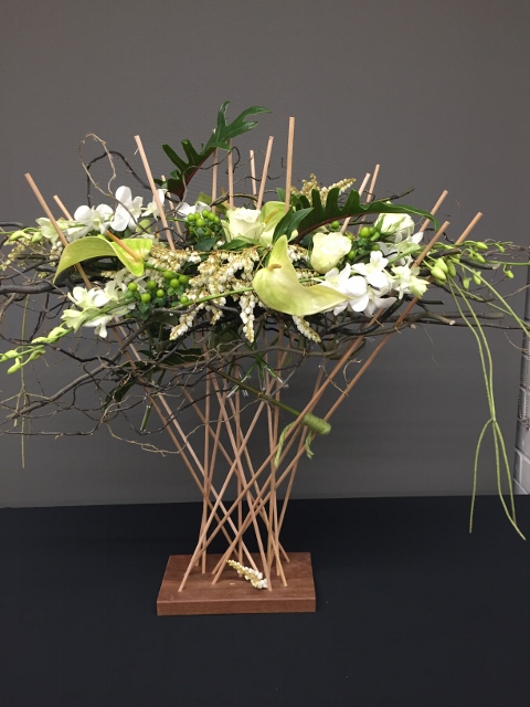 In September, Noreen conducted a contemporary workshop on spider web technique. We had fun learning such a versatile, adaptable contemporary technique that we can use to make all kinds of designs with minimum amount of flowers to produce maximum impact. The Bench was titled ‘awakenings’ and ‘stem, spike or truss’ was the horticultural item.