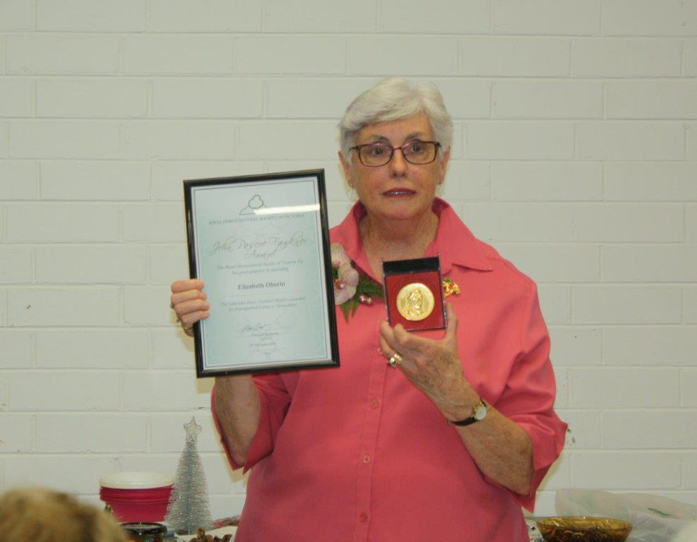 During the meeting we all had the pleasure of witnessing our president Elizabeth Oberin being handed the ‘John Pascoe Fawkner Gold Award’ by the Royal Horticultural Society for her great contribution to floral art over the years. She is also the president of Victorian Floral Art Association Inc and is a very worthy recipient of this award. Congratulations Elizabeth!