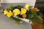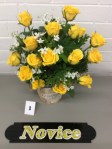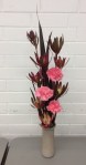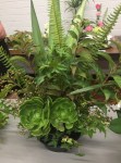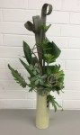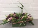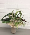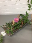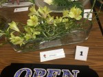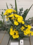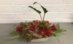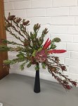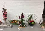 Noreen conducted a workshop on horizontal layered design at our April meeting. Using various dried and fresh materials along with flowers, leaves, bark and twigs we made some beautiful arrangements with horizontal lines as the dominant factor in the designs. We learnt how to create interest and areas of accents by using bold plant forms, different textures and contrasts of colours. ‘Designs including gluing techniques’ was the bench title and ‘foliage’ was the horticultural item.
