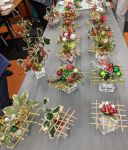In November, being the last meeting for the year, we had a workshop where we made Xmas table decorations using a grid made of sticks and a glass cube filled with Xmas baubles and holly etc. The bench design was a contemporary Xmas Design judged by popular vote. Jenny Peiper won the first prize and Rosie Dougherty won the second prize. Our president Elizabeth handed over the annual prizes for the bench winners for 2019. Elizabeth Oberin won the ‘open’ category, Ginta Pindard won ‘intermediate’ section, Rhonda Dare won the ‘novice’ section, Rosie Dougherty won ‘wired work’ and Haeztra Goonetilleke won ‘from the garden’ category. Congratulations to all the winners.